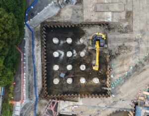 橋脚の土台の施工のために、基礎部分を掘り起こしているところです。