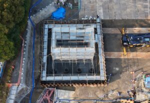 中心に見える足場は、鉄筋組立用の仮設足場です。