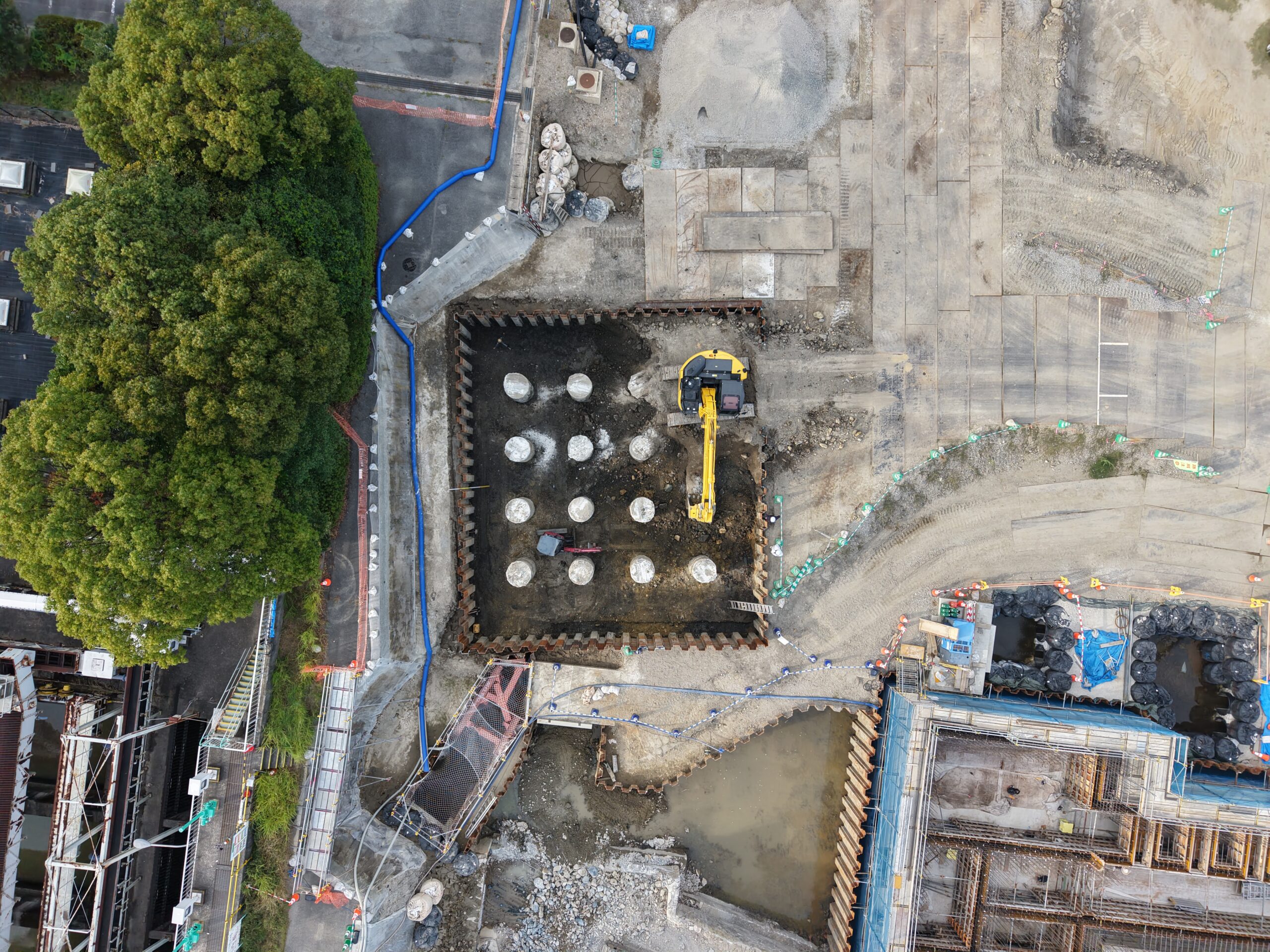 橋脚の土台の施工のために、基礎部分を掘り起こしているところです。
